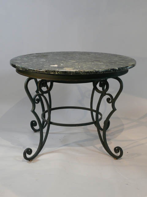 CIRCULAR GREEN MARBLE VERDE ANTIQUO ON A WROUGHT IRON BASE VERDE GREEN BRONZE FINISH 105 CM DIAM.