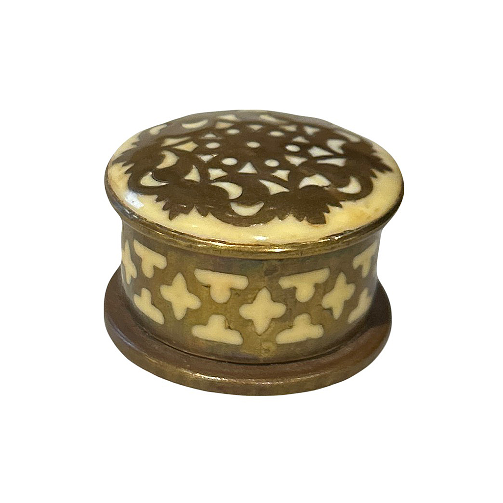CIRCULAR SNUFF / PILL BOX CREAM ENAMEL BACKGROUND WITH BRASS DECOARATION 4 CM DIAMETER