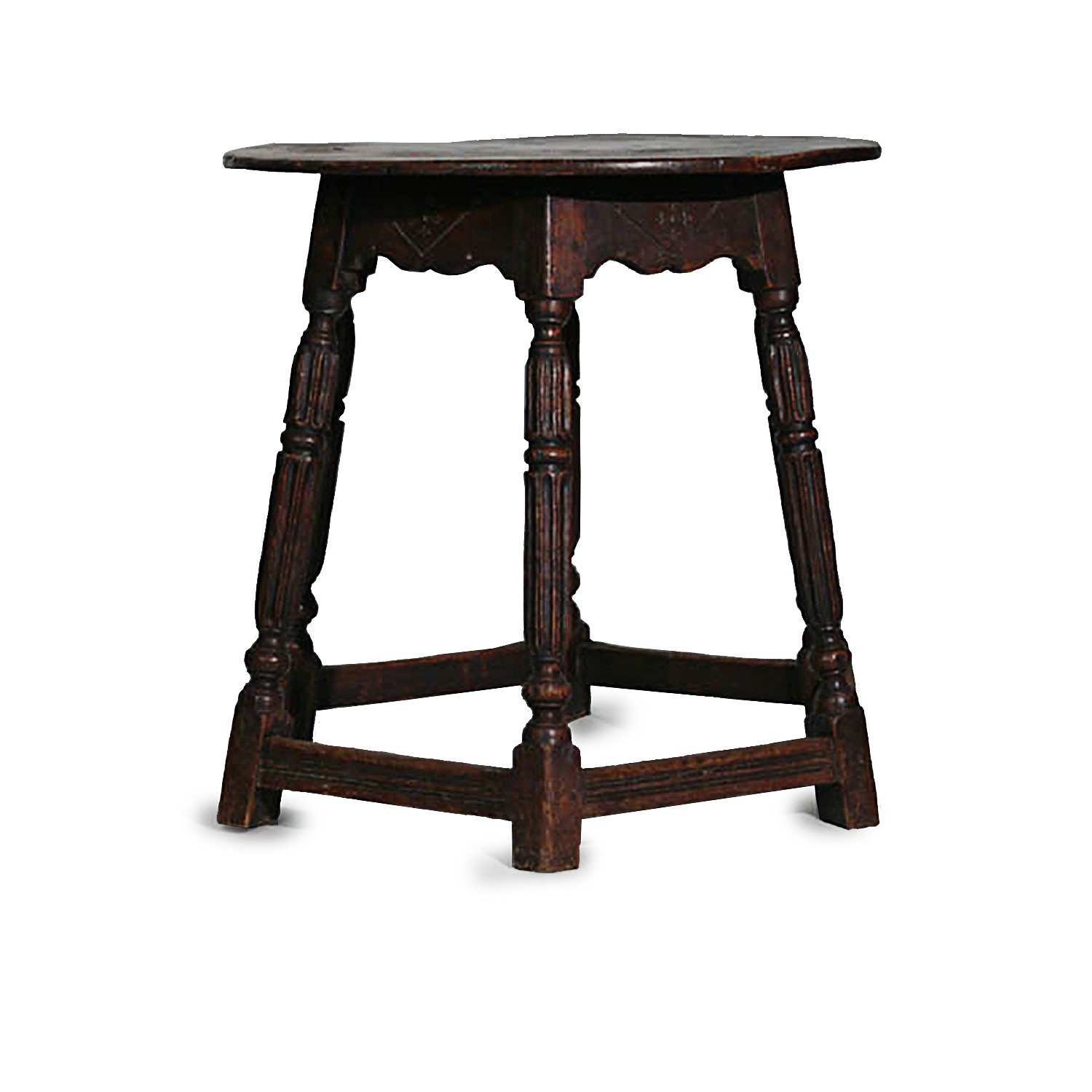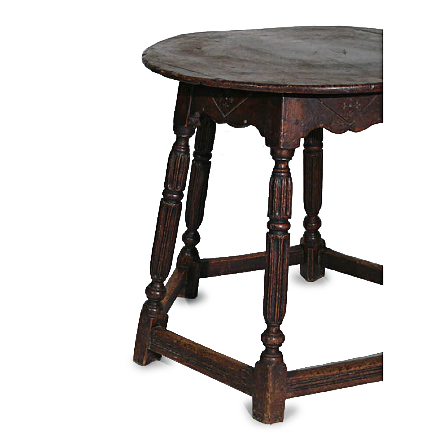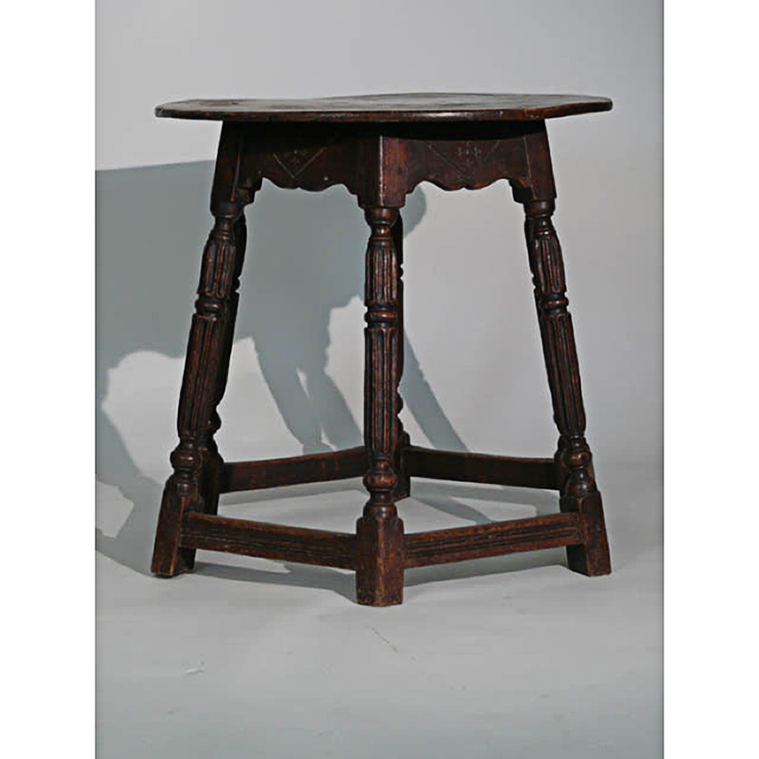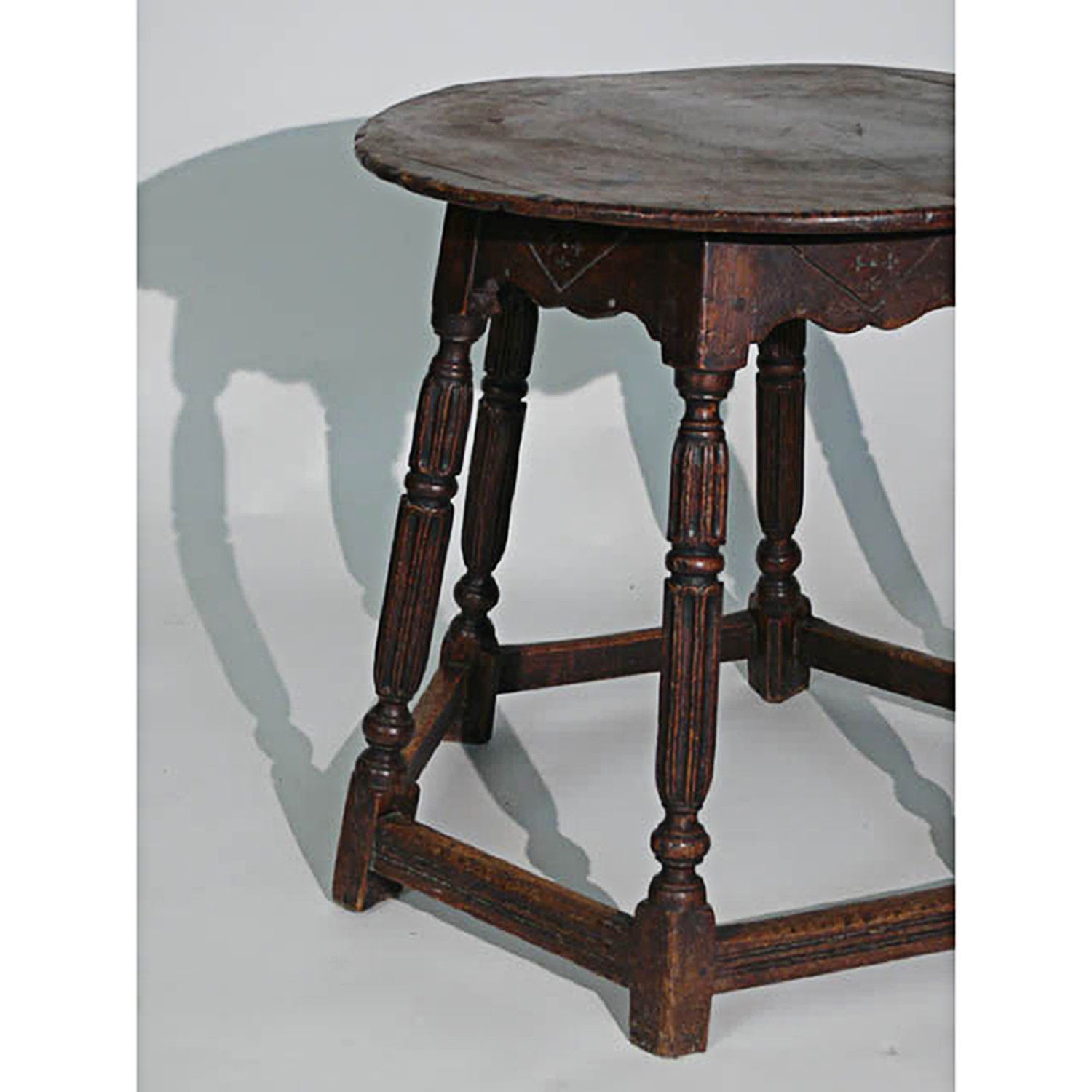 CIRCULAR TABLE ELM TOP SIX CARVED SPLAYED LEGS ELIZABETHAN STYLE BY TOZER 73 CM DIAM 71 CM HIGH