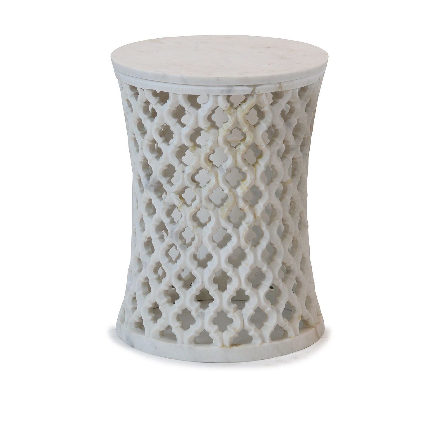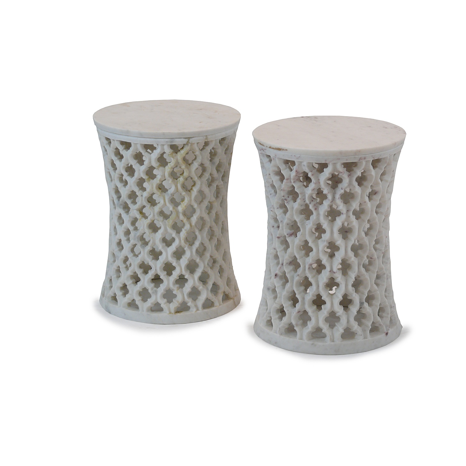CIRCULAR WHITE MARBLE STOOL / LOW TABLE ORNATE FRETTED ISLAMIC DESIGN 41 CM HIGH 31 CM DIAM (X2)