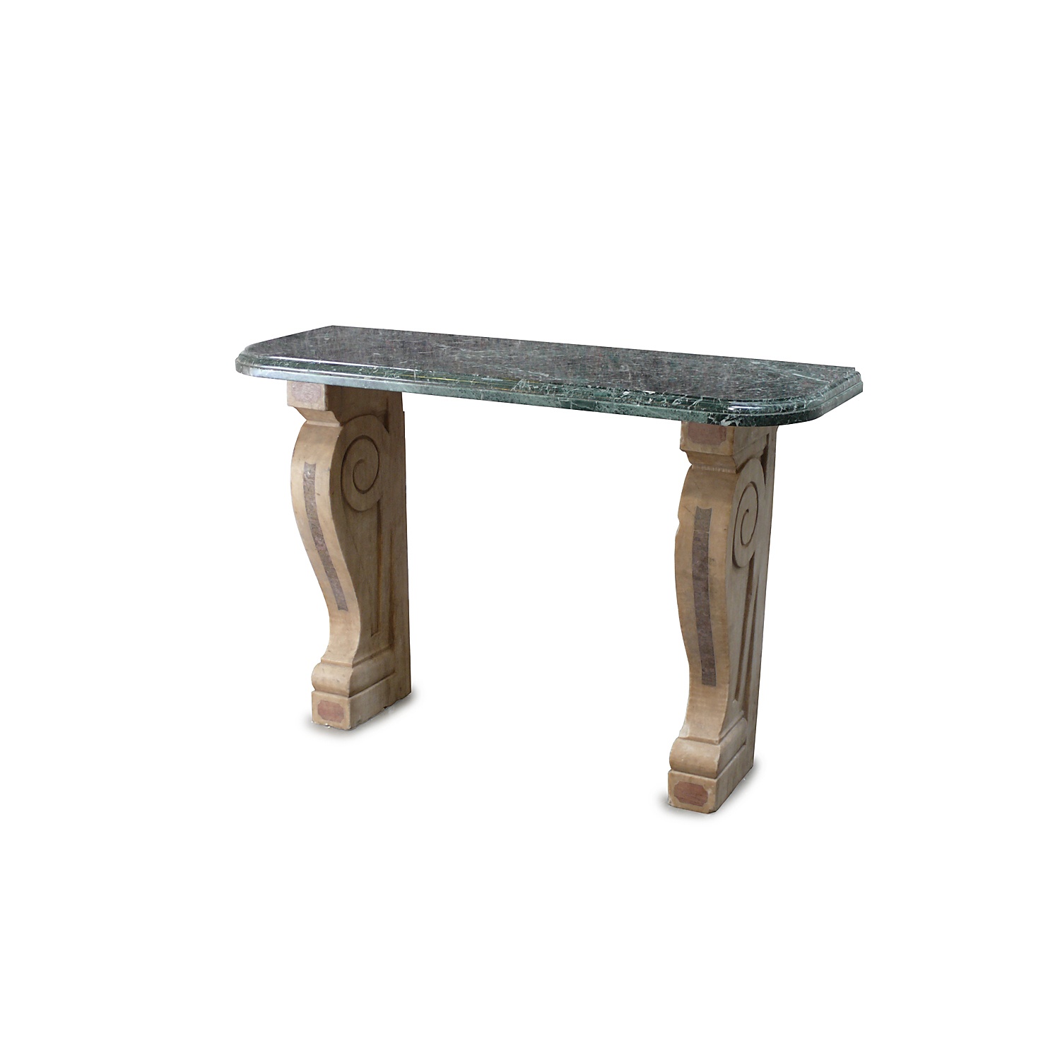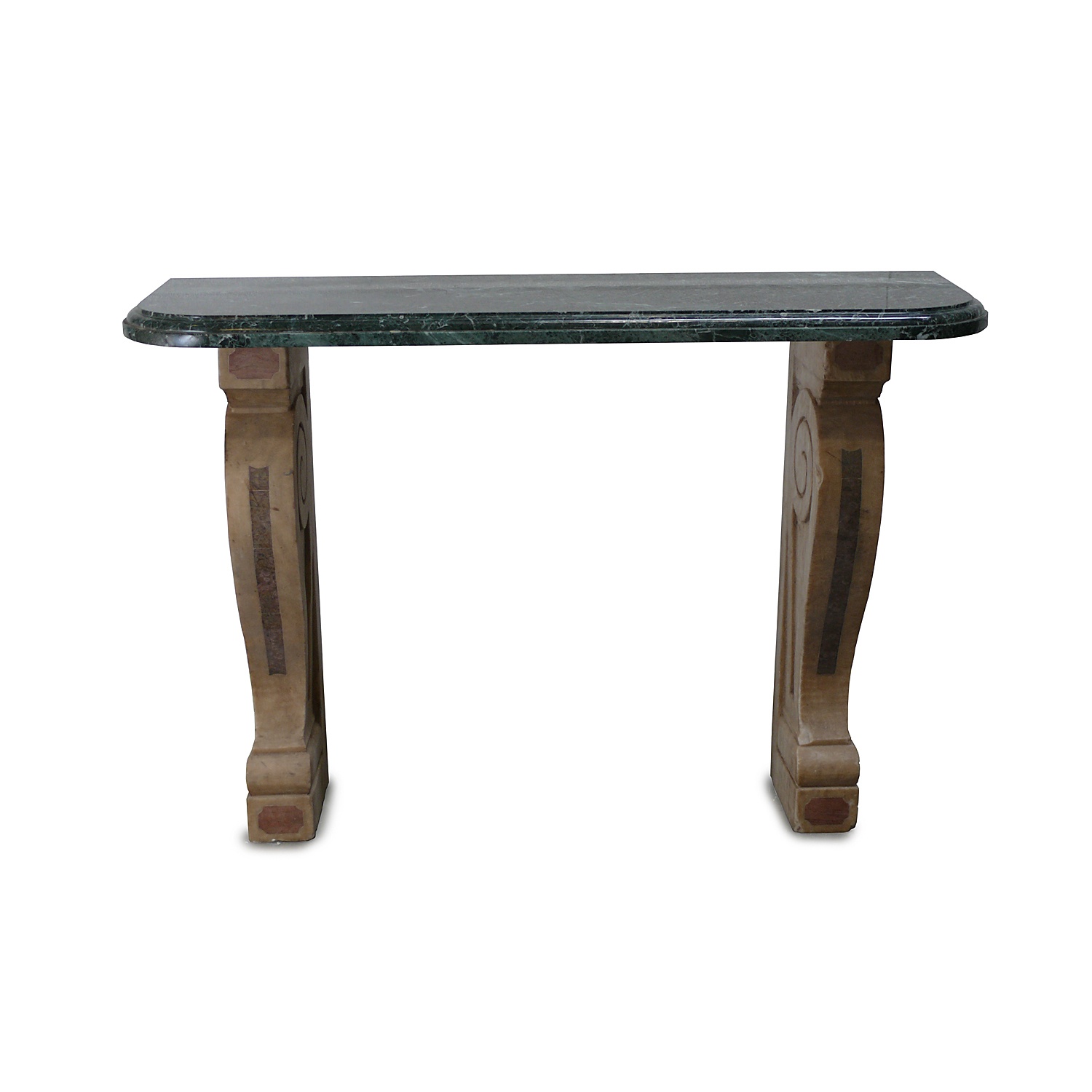 CLASSICAL CARVED WHITE MARBLE CONSOLE TABLE WITH TWO SHAPED SUPPORTS AND A VERDI ANTIQUO GREEN MARBLE TOP