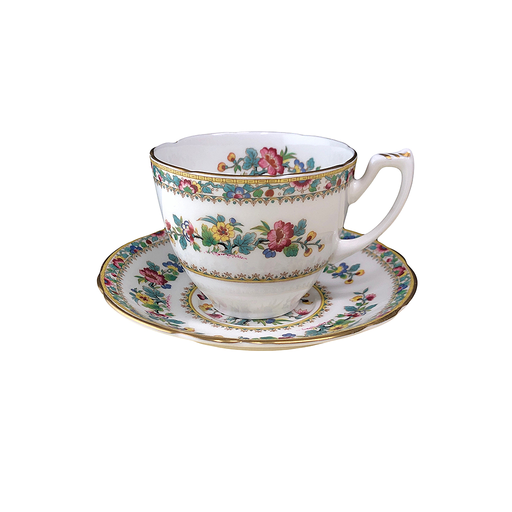 COALPORT MING ROSE PINK AND YELLOW FLORAL CHINA TEACUP AND SAUCER (X6)