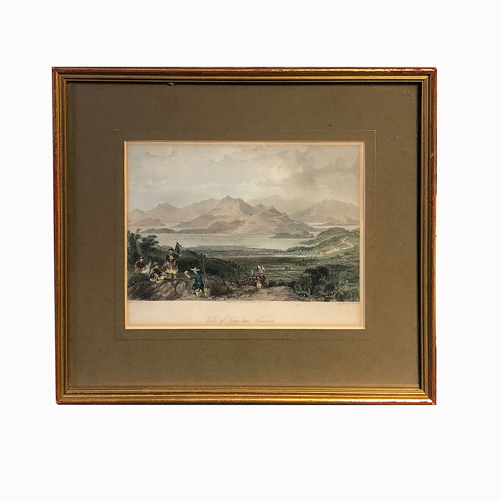 COLOUR CHINESE PRINT VIEW OF THE VALE OF TING HAI CHUSAN BY THOMAS ALLOM 1848 IN A GILT FRAME 10/i X 12/i WITH A GREEN MOUNT