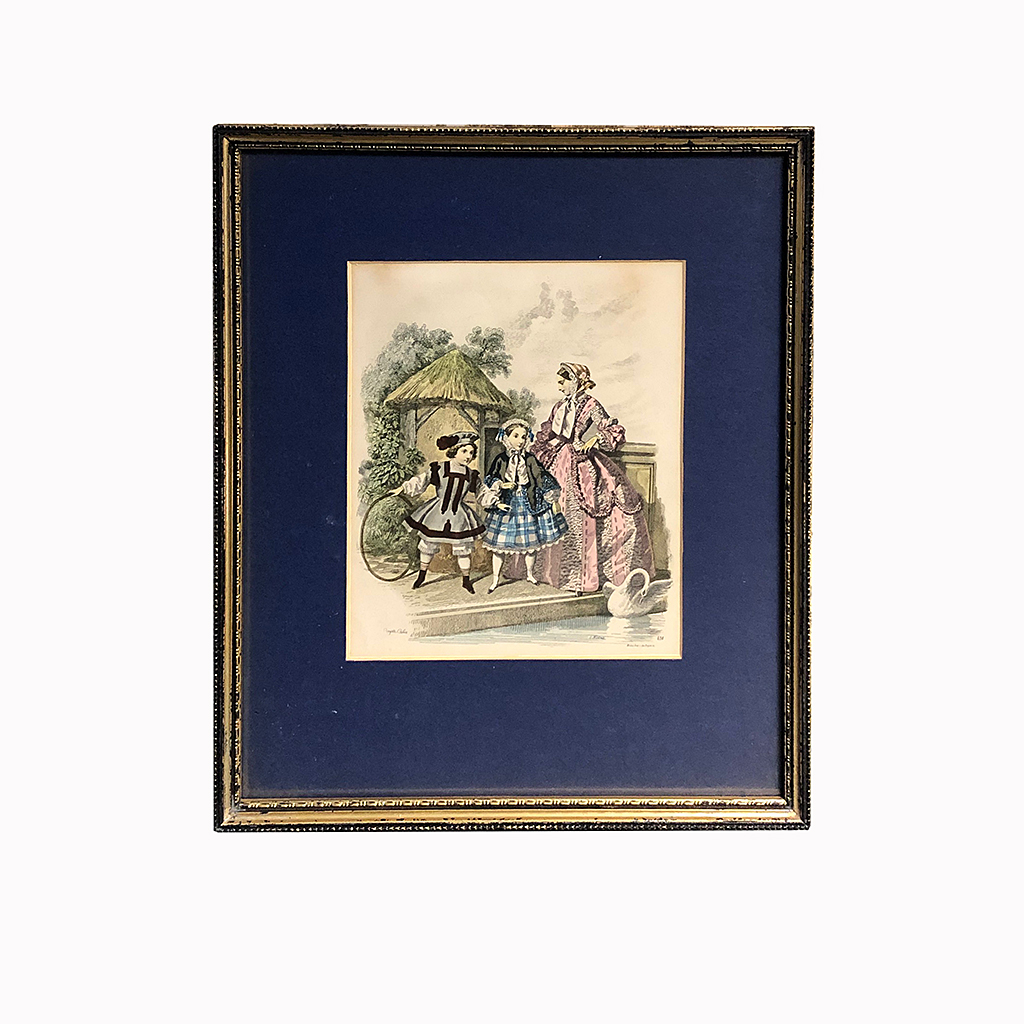 COLOUR FASHION PRINT IN A GILT FRAME AND NAVY BLUE MOUNT 12/i X 10 /i