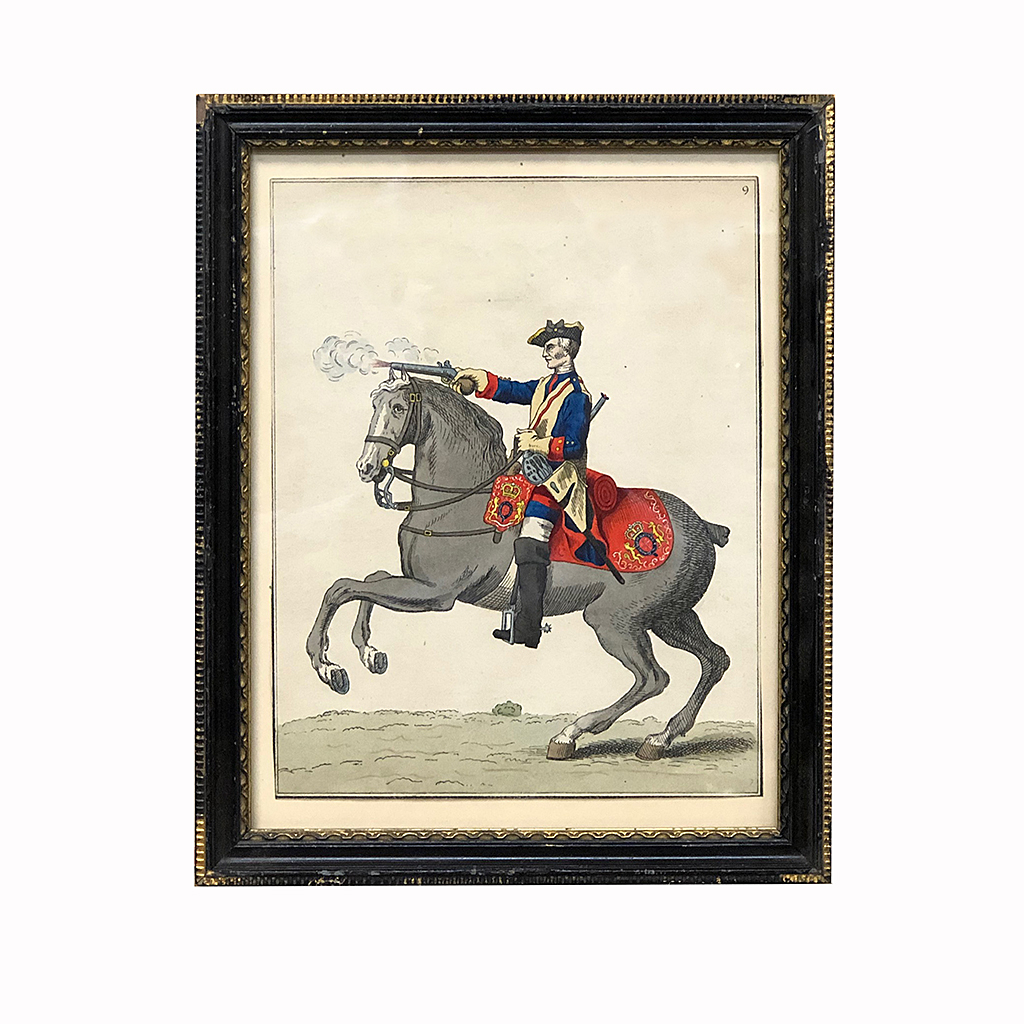 COLOUR MILITARY PRINT C18TH SOLDIER ON HORSEBACK IN A BLACK AND GOLD FRAME 10/i X 8/i