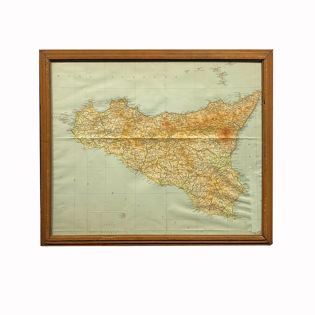 COLOUR PRINT 20THC MAP OF SICILY IN A STEPPED LIGHT OAK FRAME 20/i X 24/i