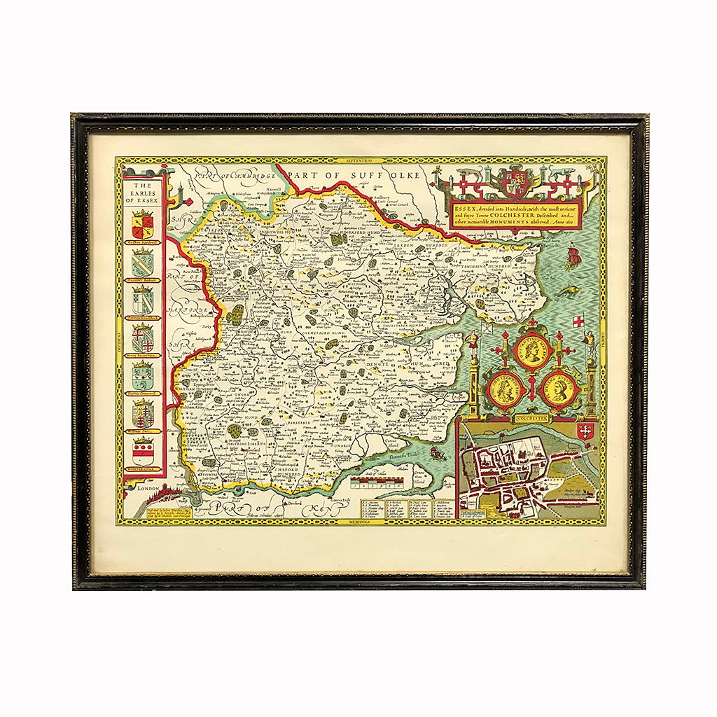 COLOUR PRINT ANTIQUE MAP OF SUFFOLKE IN A BLACK FRAME 18/i X 22/i