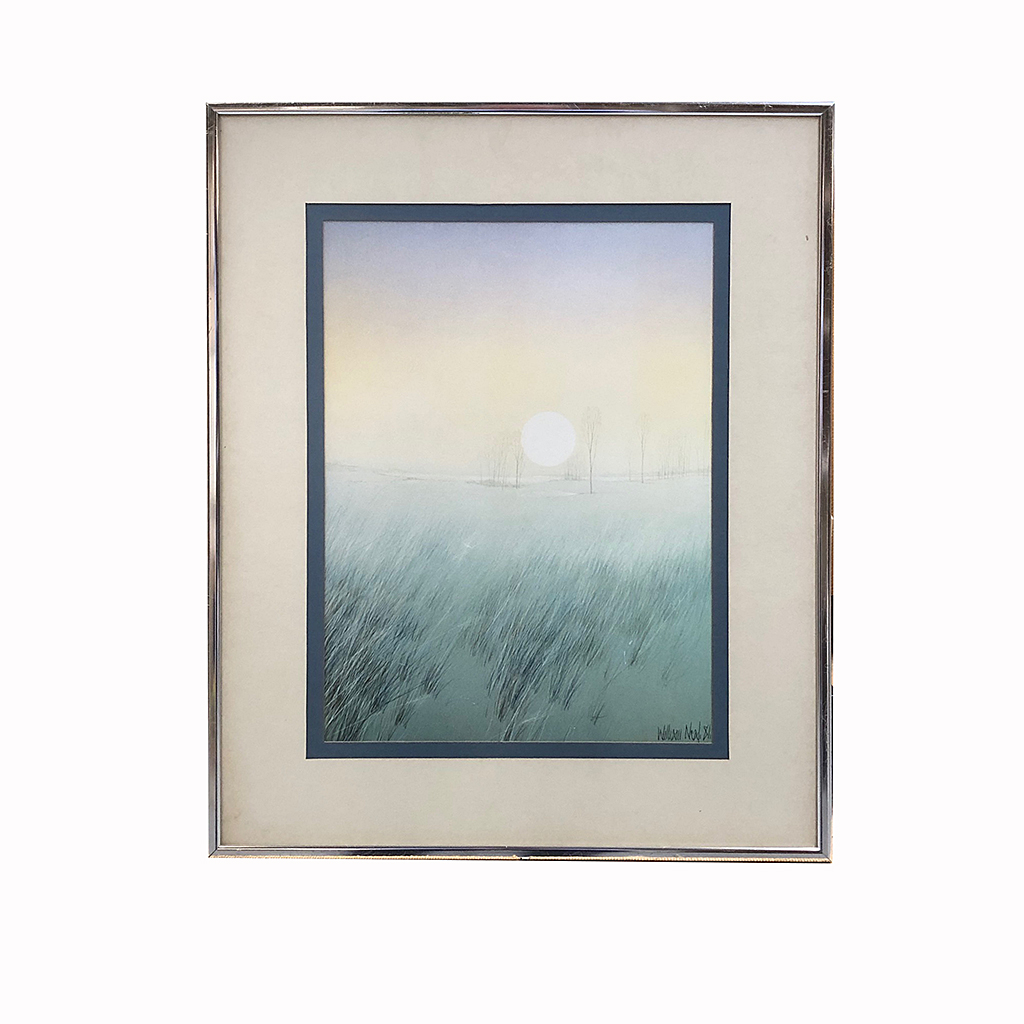 COLOUR PRINT LANDSCAPE WITH SUN RISING OVER MARSHLAND SIGNED AND DATED WILLIAM NEAL '81 IN A STEEL FRAME 22 X 18