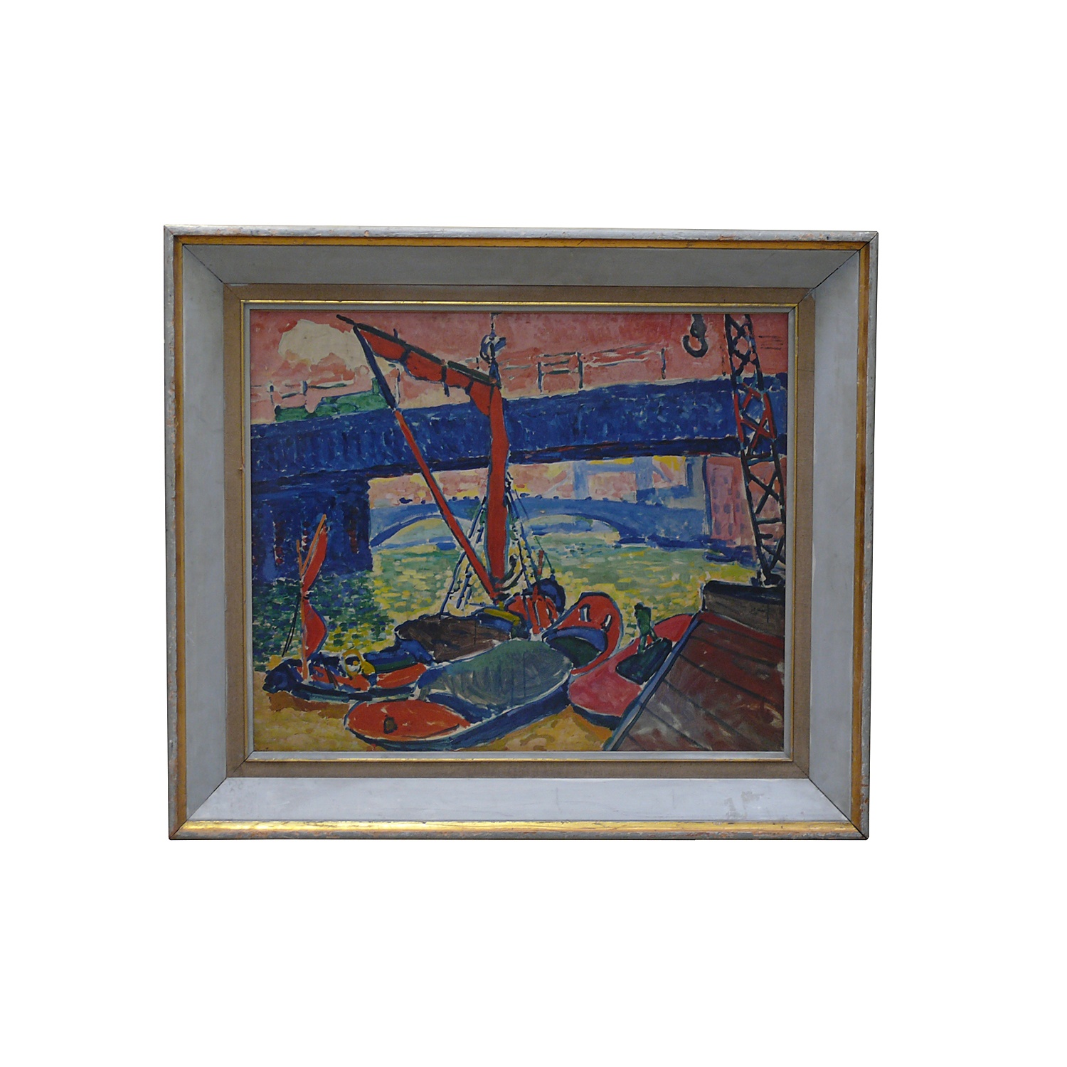 COLOUR PRINT MOUNTED ON BOARD BARGES ON THE THAMES (1906) BY ANDRE DERAIN (1880-1954) IN A 4/i GREY AND GOLD FRAME 19/i X 23/i