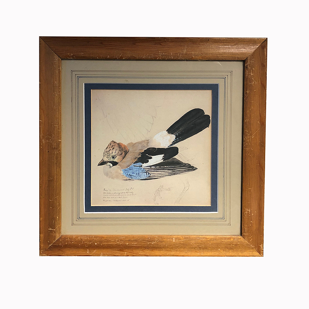 COLOUR PRINT OF A JAY BIRD IN A PINE FRAME 12/i X 15/i