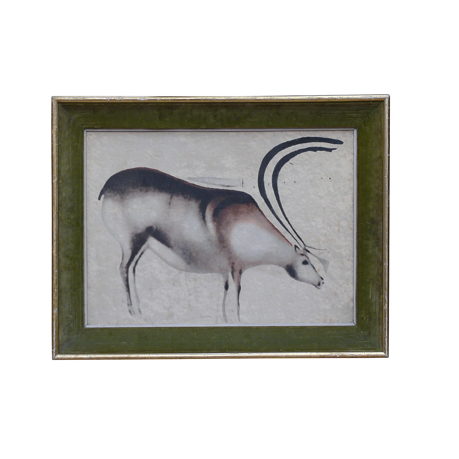 COLOUR PRINT OF A PRE HISTORIC CAVE PAINTING A BULL FROM LASCAUX DORDOGNE IN A GREY AND GREEN VELVET LINED FRAME
