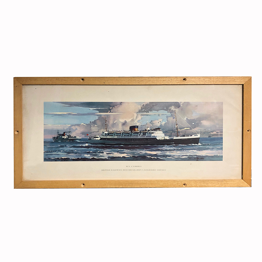 COLOUR RAILWAY CARRIAGE PRINT M V CAMBREA SHIP IN A PLAIN WOOD FRAME 10/i X 20/i