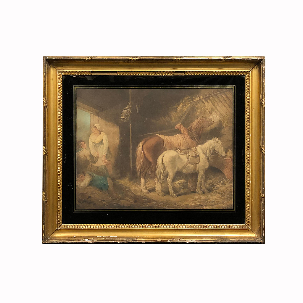 COLOURED ANTIQUE PRINT THE STABLES IN A BLACK FRAME WITH A BLACK AND GOLD GLASS MOUNT 20/i X 23/i