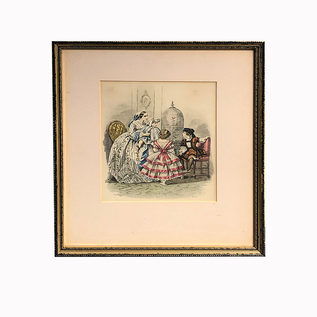 COLOURED FASHION PRINT IN A SLIM GILT FRAME WITH CREAM MOUNT 12/i X 10 /i