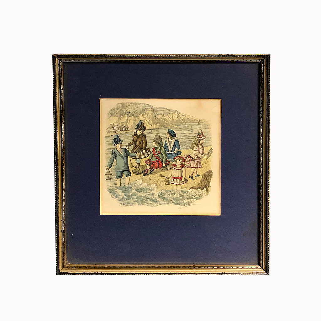 COLOURED FASHION PRINT IN A SLIM GILT FRAME WITH NAVY BLUE MOUNT 12/i X 10/i