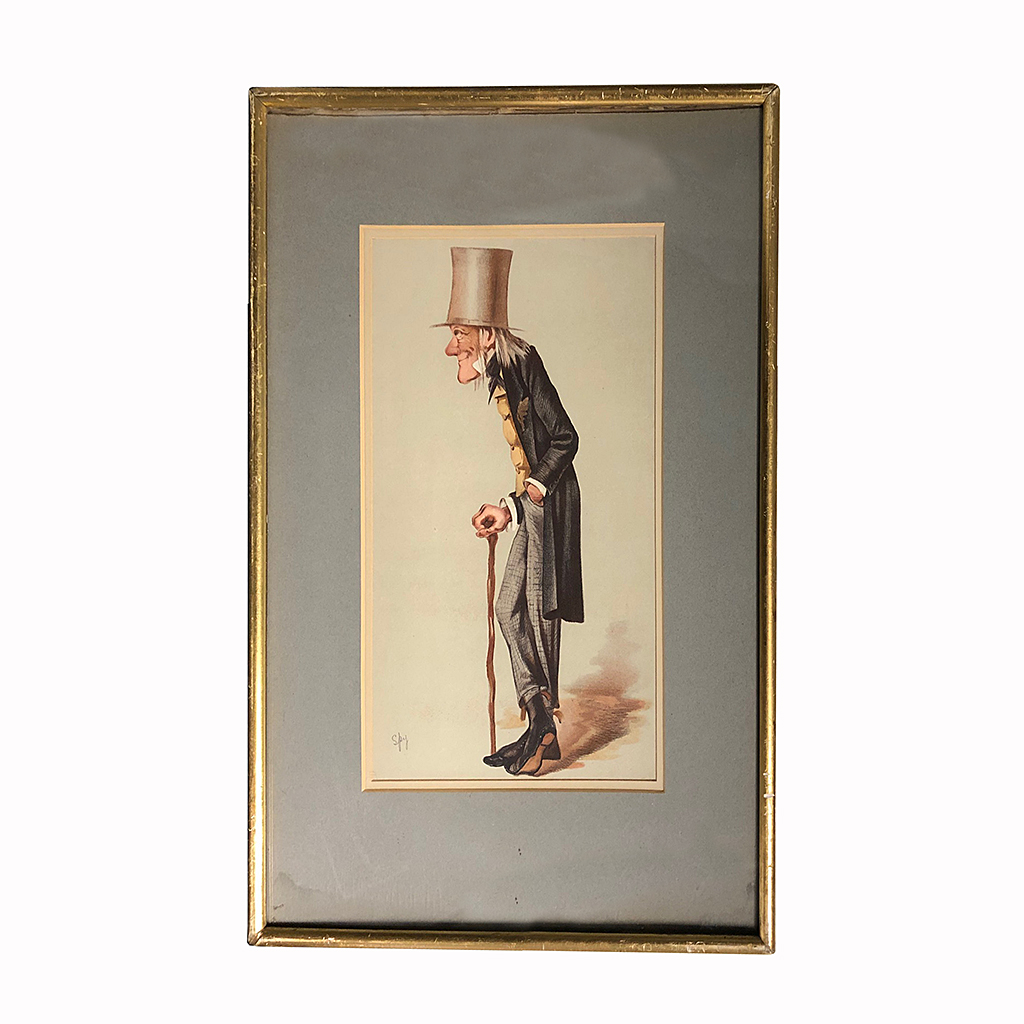 COLOURED PRINT SPY CARTOON MAN WEARING A TOP HAT IN A GILT FRAME WITH GREY MOUNT