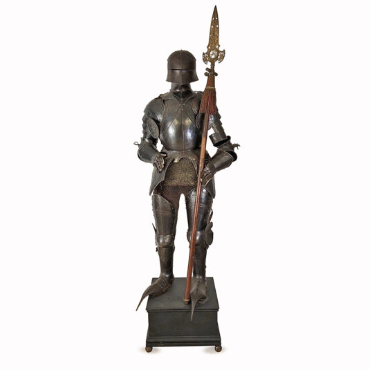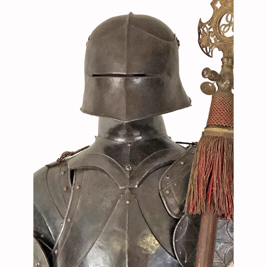 COMPLETE SUIT OF ANTIQUE GERMAN ARMOUR WITH GILT METAL HALBARD PIKE LATE 15TH CENT STYLE 200 CM HIGH