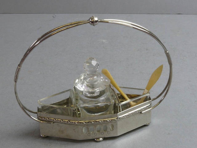 CONDIMENT SET E.P. SILVER ART DECO MUSTARD SALT AND PEPPER