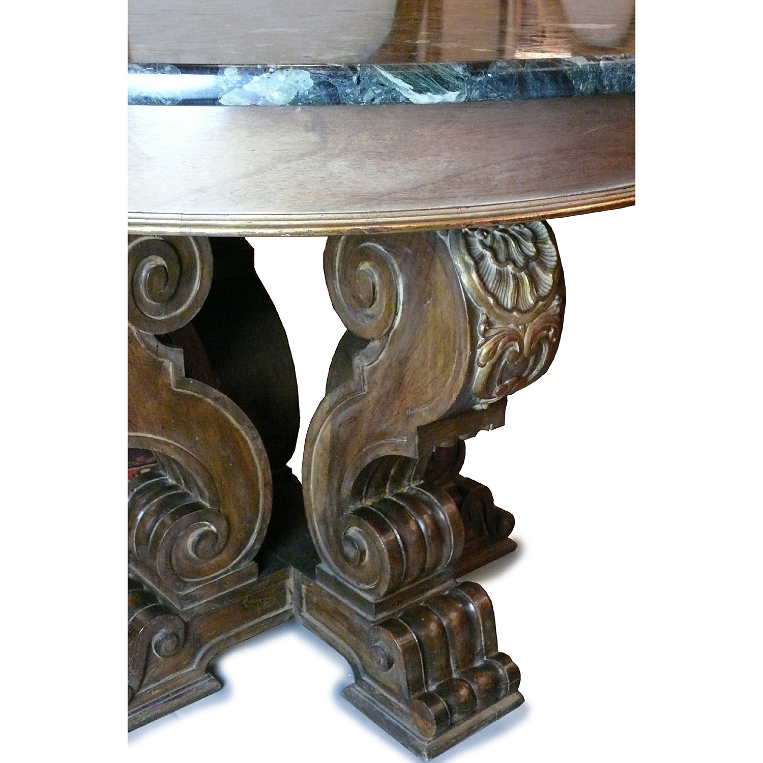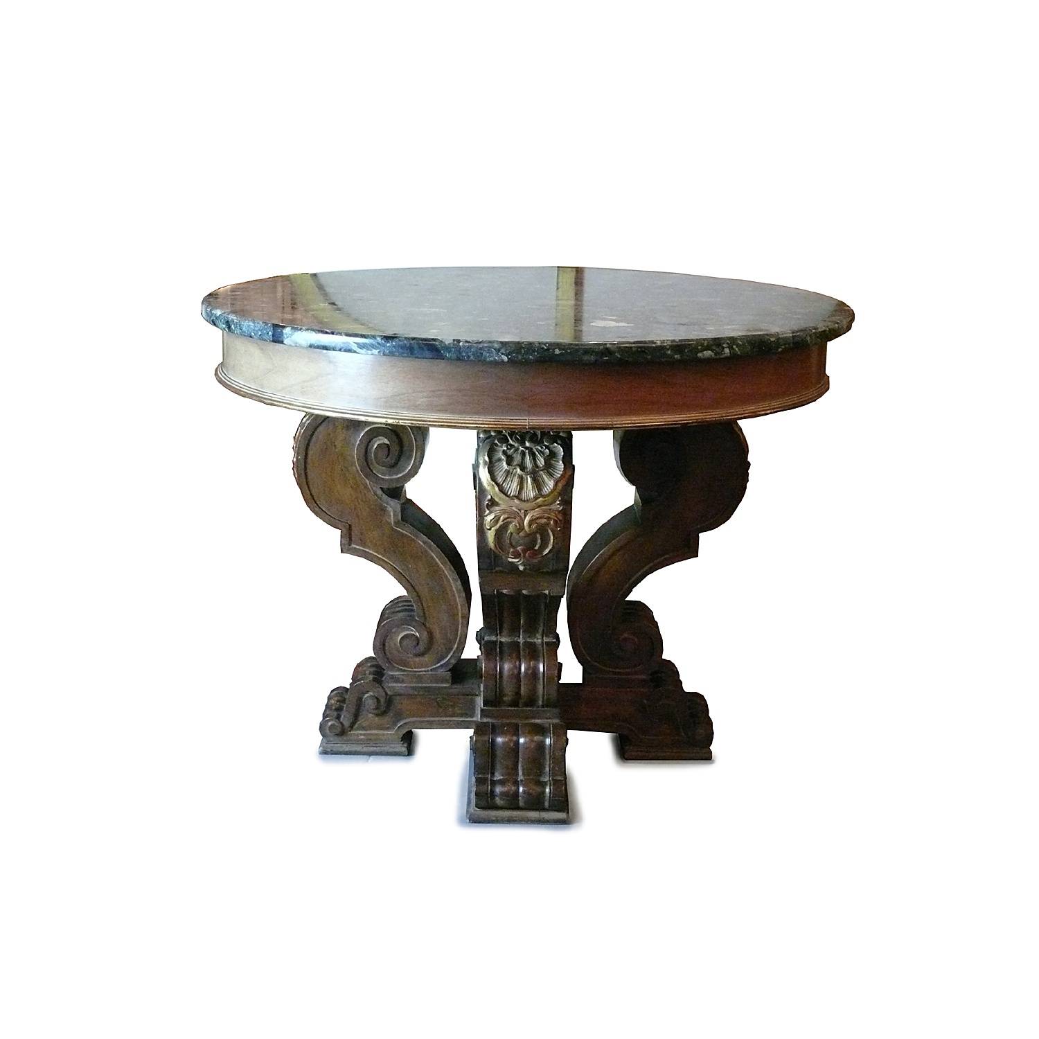 CONTINENTAL CENTRE TABLE CARVED WALNUT WITH PARCEL GILT SHELL MOTIF TO EACH SUPPORT WITH GREEN VERDI ANTIQUO MARBLE TOP 106 CM DIAM. 78 CM HIGH