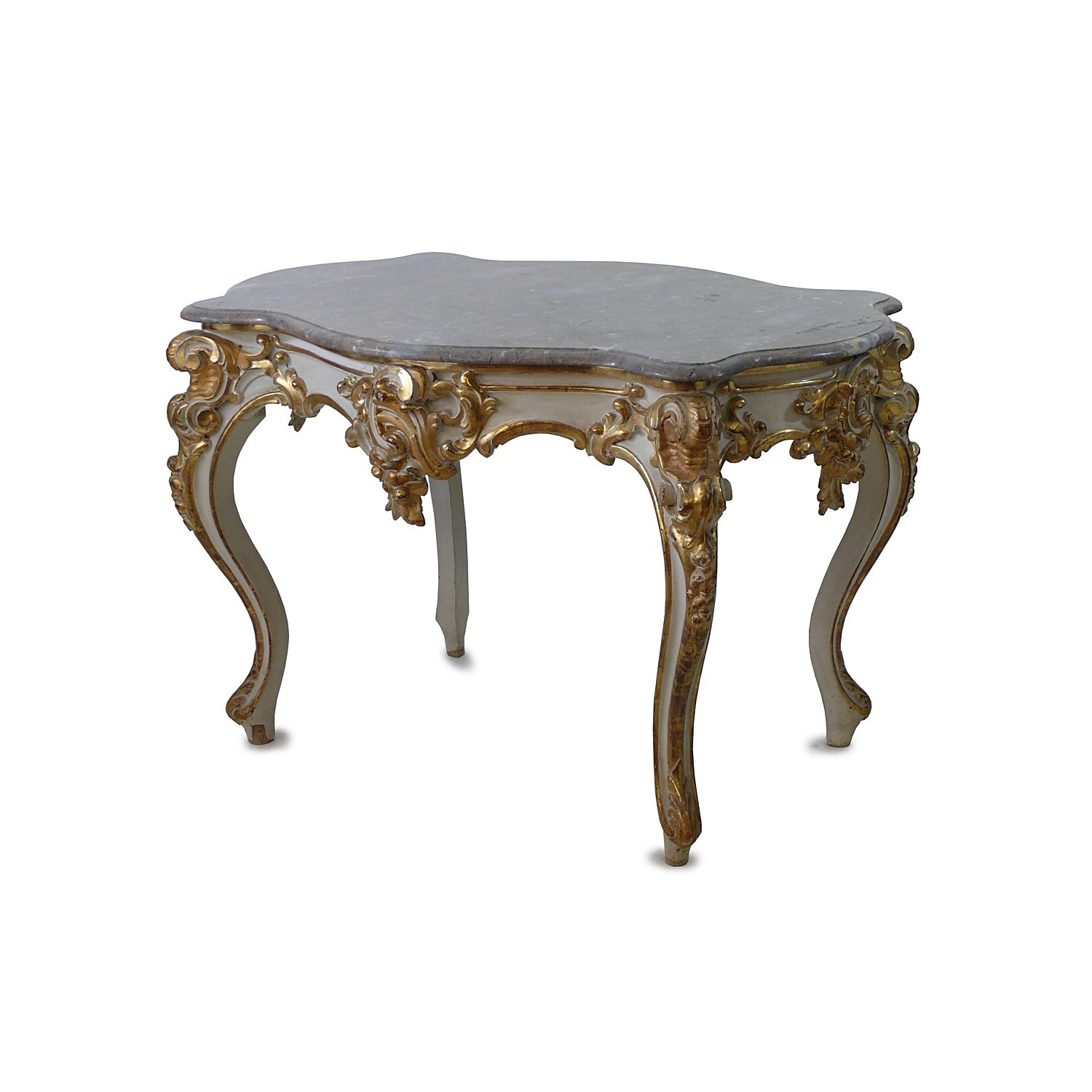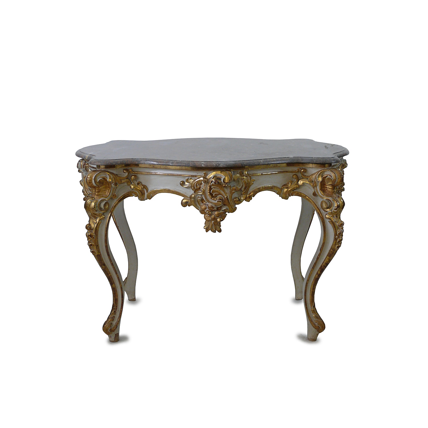 CONTINENTAL CREAM AND GILT CENTRE TABLE WITH GREY SAINT LARY MARBLE TOP 116 CM LONG 86 CM WIDE 77 CM HIGH
