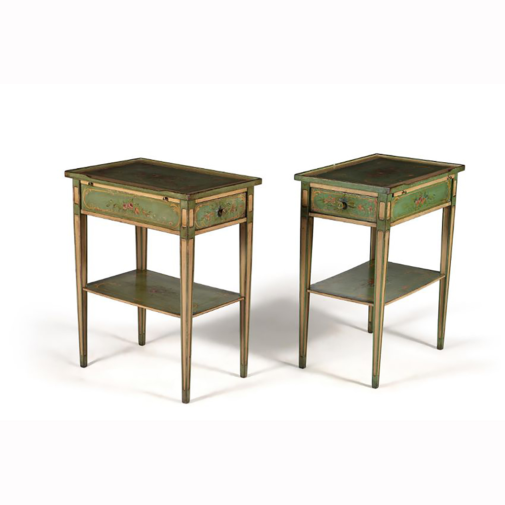 CONTINENTAL TWO TIER OCCASIONAL TABLE GREEN PAINTED WITH FLORAL POLYCHROME DECORATION 75 CM HIGH 59 CM WIDE 39 CM DEEP (X2)