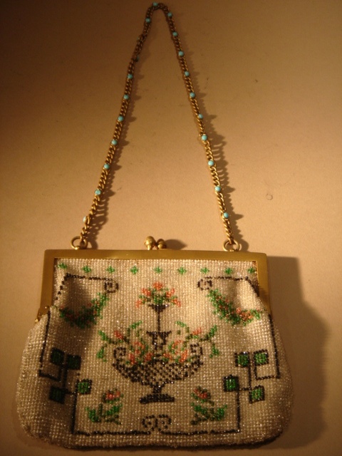 CREAM BEADED HANDBAG WITH TURQUOISE SET CHAIN STRAP 16 CM WIDE