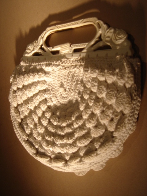 CREAM CROCHET HANDBAG WITH WHITE ORNATE BAKELITE HANDLE 21 CM WIDE