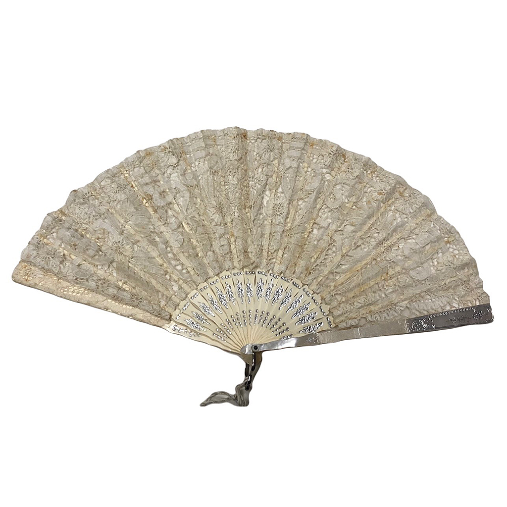 CREAM LACE FAN WITH DECORATIVE STICKS AND MOTHER OF PEARL GUARD STICKS 22 CM LONG