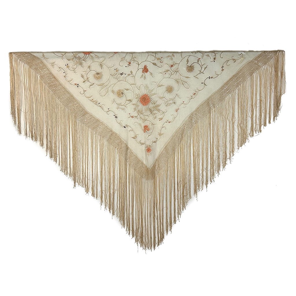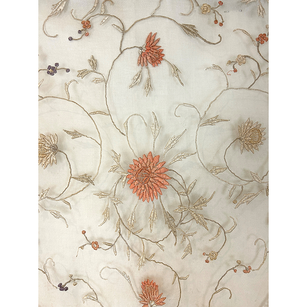 CREAM / BEIGE NET SHAWL WITH CREAM AND LIGHT CORAL FLORAL EMBROIDERY AND LONG FRINGING