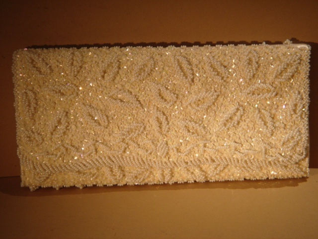 CREAM PEARL SEQUINED OBLONG CLUTCH HANDBAG 23 CM WIDE
