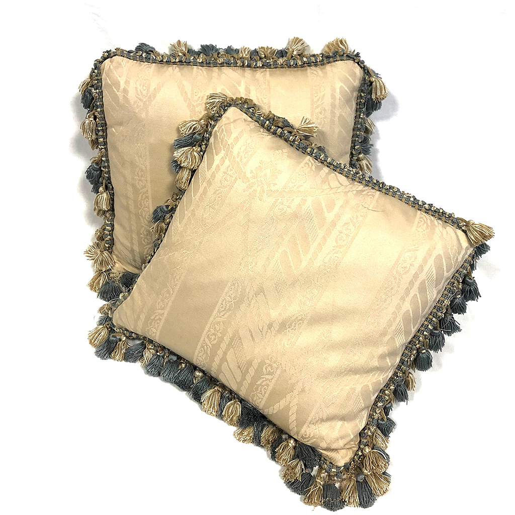 CREAM SQUARE WOVEN DAMASK CUSHION WITH TASSEL BORDER EDGE IN CREAM AND BLUE 33 CM X 33 CM