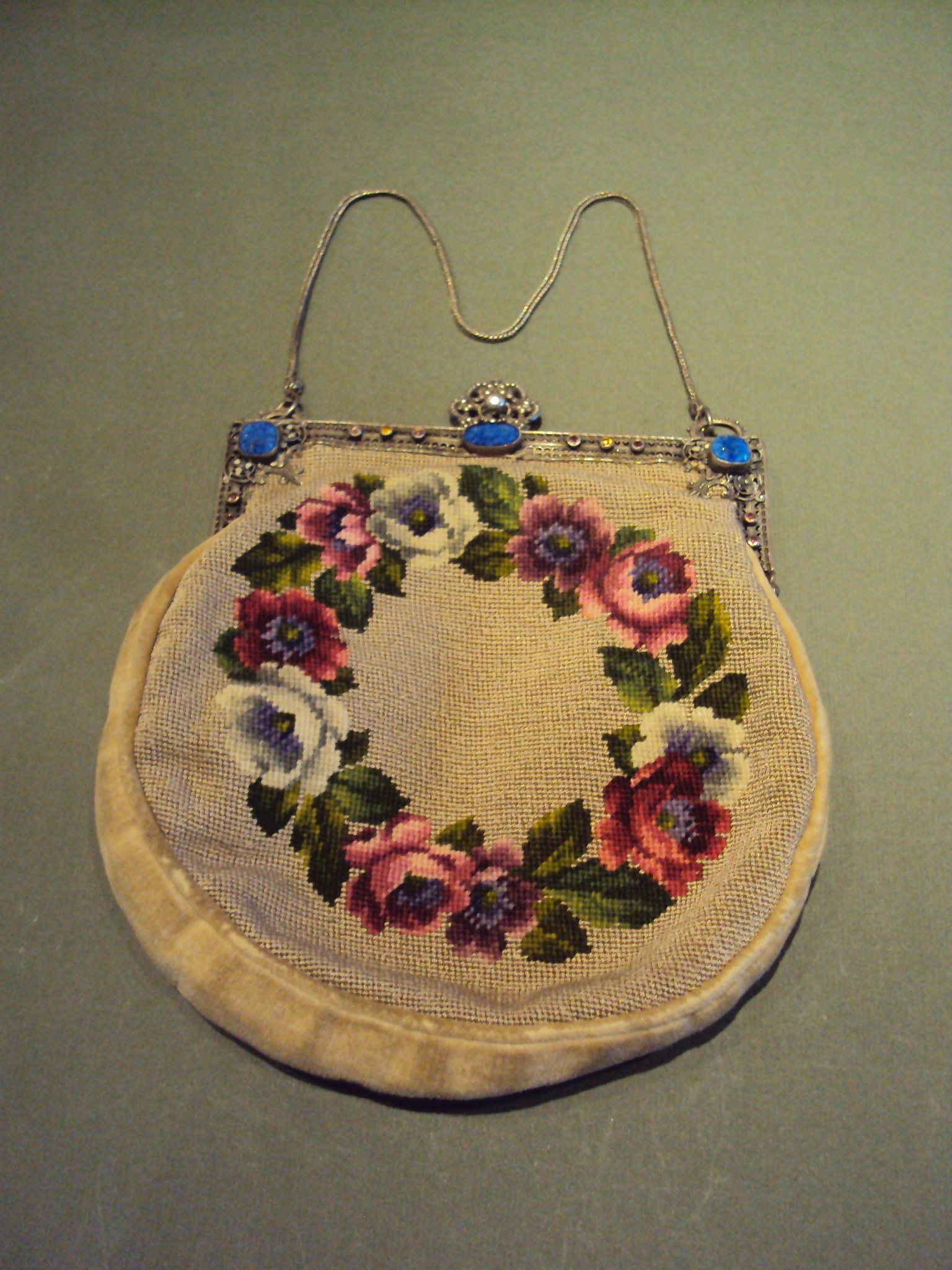 CREAM TAPESTRY HANDBAG WITH FLORAL WREATH PATTERN SILVER HANDLE WITH LAPIS MOUNTS