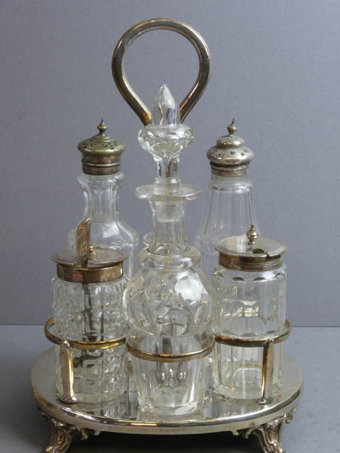 CRUET SET CIRCULAR E.P. SILVER STAND WITH SIX CUT GLASS BOTTLES