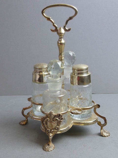 CRUET SET E.P.SILVER CLOVER SHAPED STAND WITH FOUR CUT GLASS BOTTLES