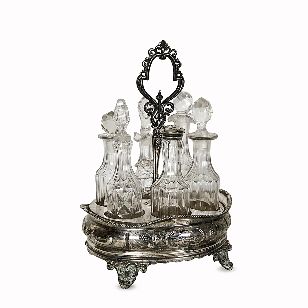 CRUET SET E.P. SILVER ORNATE CIRCUALR STAND WITH HANDLE AND SIX GLASS BOTTLES 30 CM HIGH