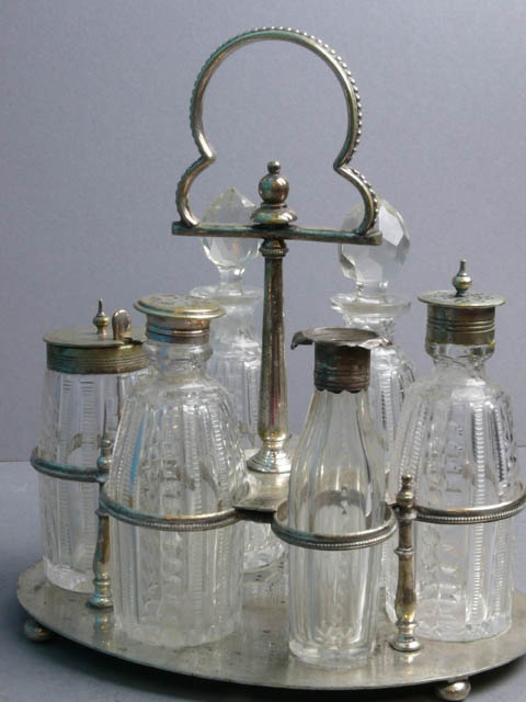 CRUET SET E.P. SILVER OVAL ON BALL FEET WITH SIX CUT GLASS BOTTLES