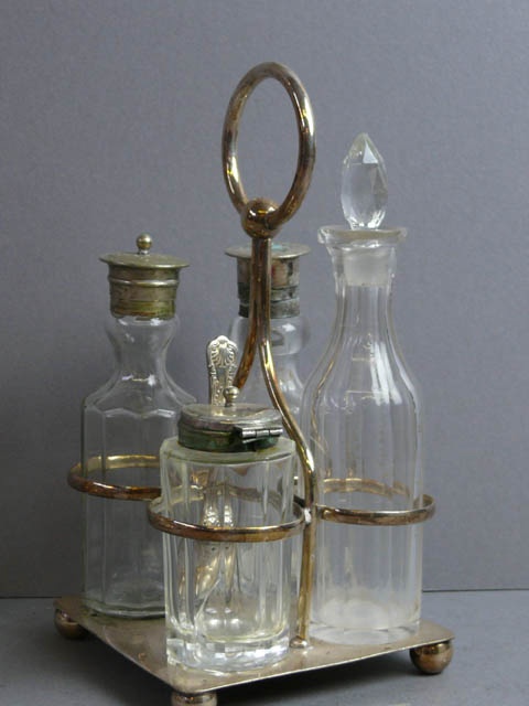 CRUET SET E.P. SILVER SQUARE STAND ON BUN FEET WITH FOUR CUT GLASS BOTTLES