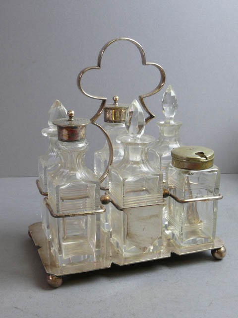 CRUET SET E.P. SILVER STAND ON BUN FEET WITH SIX CUT GLASS BOTTLES