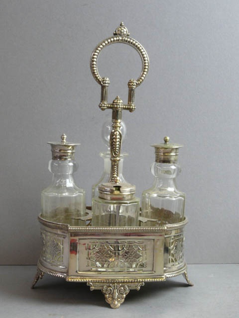 CRUET SET E.P. SILVER STAND WITH FOUR CUT GLASS BOTTLES