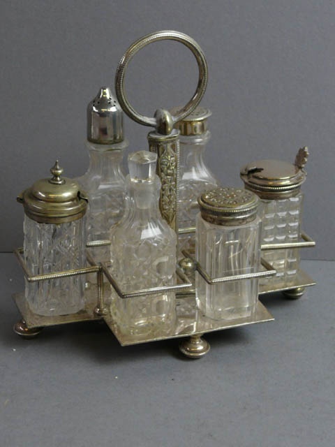 CRUET SET E.P. SILVER STEPPED ON BALL FEET WITH SIX CUT GLASS BOTTLES