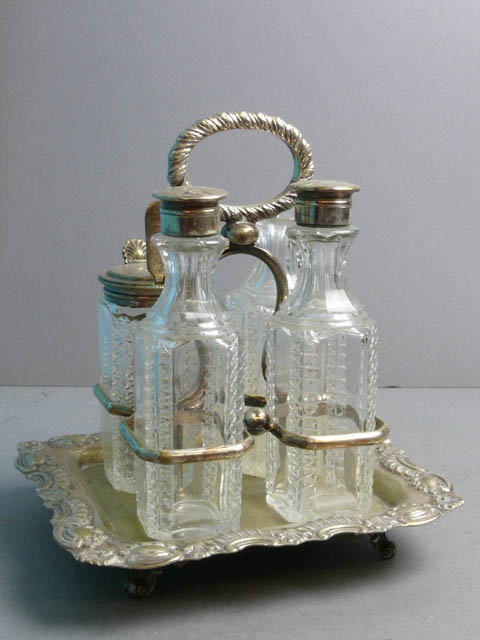 CRUET SET E.P. SILVER WITH FOUR CUT GLASS BOTTLES
