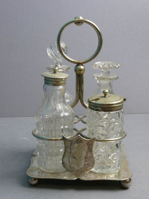 CRUET SET E.P. SILVER WITH FOUR CUT GLASS BOTTLES