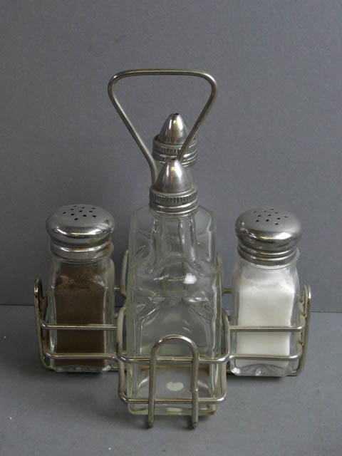 CRUET SET MODERN CHROME WITH FOUR GLASS BOTTLES