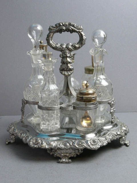 CRUET SET ORNATE E.P. SILVER WITH SIX CUT GLASS BOTTLES