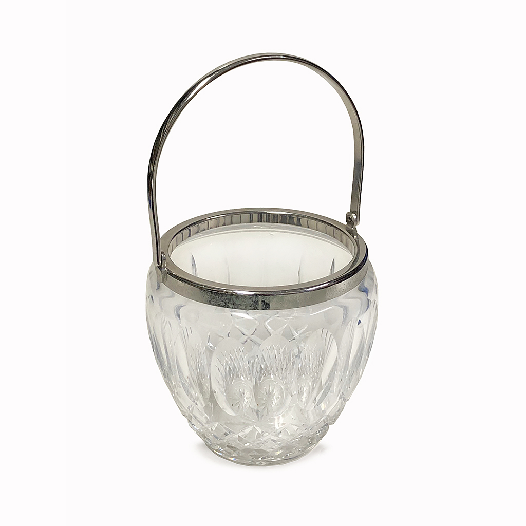 CUT GLASS ICE BUCKET WITH SILVER RIM AND HANDLE