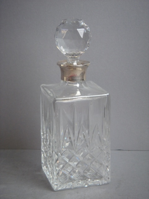 CUT GLASS SPIRIT DECANTER SQUARE WITH STERLING SILVER NECK PLUS STOPPER 27 CM