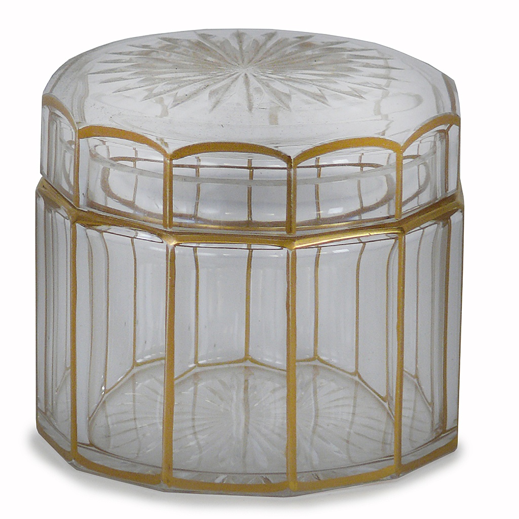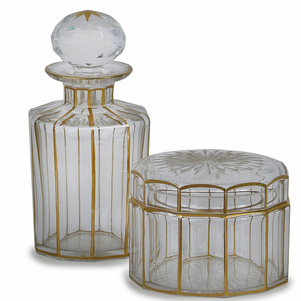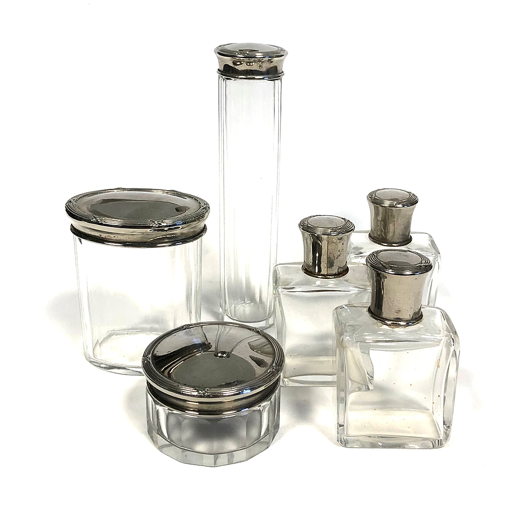 SET OF SIX SCENT BOTTLES / POTS WITH SILVER LIDS