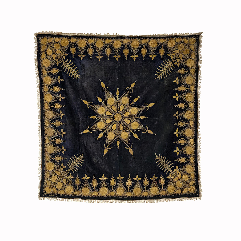 DARK BLUE VELVET TABLECOVER WITH HEAVY GOLD EMBROIDERY AND FRINGING 5'2 X 5'2