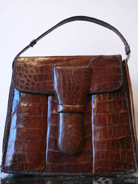 DARK BROWN CROCODILE HANDBAG WITH SLIDE MECHANISM / CLASP EDWARDIAN