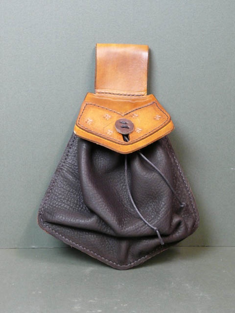 DARK TAN LEATHER POUCH BAG MEDIEVAL STYLE WITH EMBOSSED LIGHT TAN FLAP 24 CM HIGH